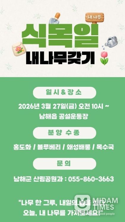 미담타임스 황명수 기자 | 남해군은 제81회 식목일을 맞아 오는 27일 오전 10시부터 남해읍 공설운동장에서 ‘내나무갖기 캠페인’을 진행한다.