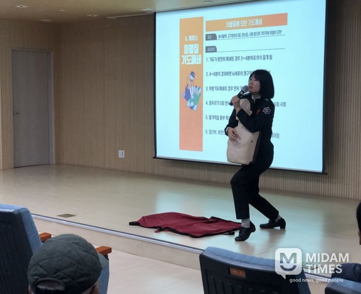 이날 교육은 김은경 강사가 진행했으며, 심폐소생술의 중요성과 함께 하임리히법, 저혈당 쇼크, 낙상사고 등 일상에서 발생할 수 있는 다양한 응급상황에 대한 대처 방법을 중심으로 이뤄졌다. 특히 실습을 병행해 참여자들이 실제 상황에서도 당황하지 않고 신속․정확하게 대응할 수 있도록 도왔다.