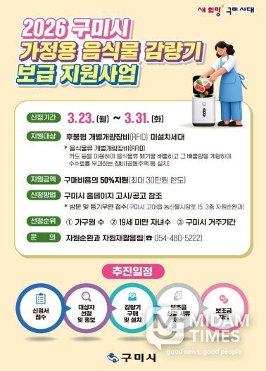 미담타임스 김준완 기자 | 구미시는 음식물류 폐기물 관리 사각지대를 해소하고 배출 편의를 높이기 위해 ‘가정용 음식물 감량기 보급 지원사업’을 추진한다.