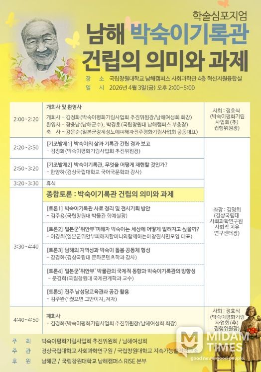 미담타임스 황명수 기자 | 경상국립대학교 사회과학연구원(원장 송원근 경제학부 교수)은 박숙이평화기림사업회 추진위원회(위원장 김정화 남해여성회장) 등과 함께 4월 3일 오후 2~5시 국립창원대학교 남해캠퍼스 사회과학관 4층 혁신지원융합실에서 ‘남해 박숙이기록관 건립의 의미와 과제’를 주제로 학술심포지엄을 개최한다.