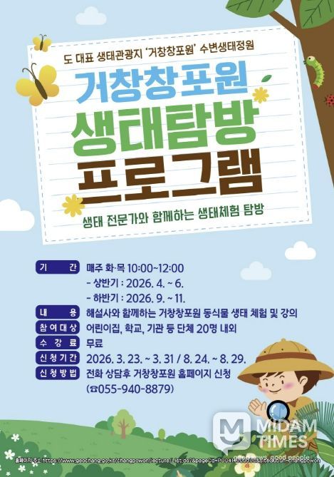 신동일 환경과장은 “거창창포원의 우수한 자연‧식물 자원을 활용한 체험 중심 교육을 통해 자연 이해도와 생태 감수성을 높이는 계기가 될 것으로 기대한다”며 “앞으로도 창포원의 교육‧체험 기능을 강화해 나가겠다”고 말했다.