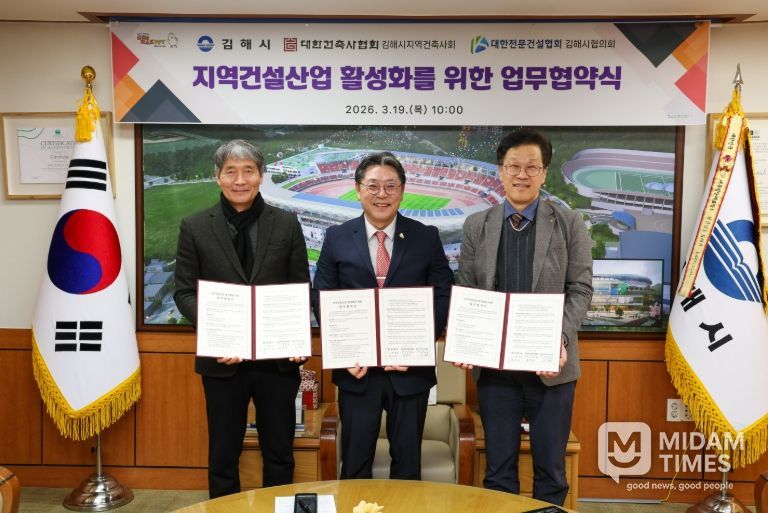미담타임스 황명수 기자 | 김해시는 지역건설산업 활성화와 지역경제 발전을 위해 19일 오전 10시 시장실에서 대한건축사협회 김해시지역건축사회, 대한전문건설협회 김해시협의회와 ‘지역건설산업 활성화를 위한 3자 업무협약’을 체결했다.