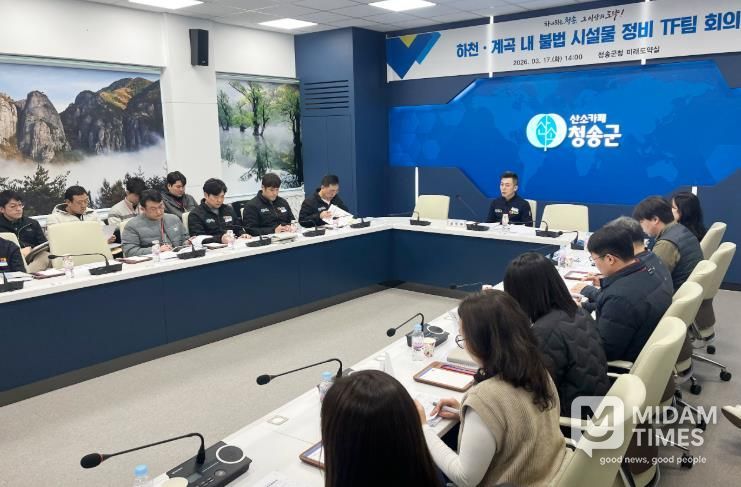 미담타임스 김준완 기자 | 청송군은 최근 국무회의에서 제시된 대통령 지시사항에 따른 후속대응으로, 지난 17일 군청 미래도약실에서 권영문 부군수 주재로 ‘하천·계곡 주변 불법시설물 정비 TF팀 회의’를 개최했다고 밝혔다.