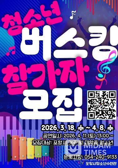 미담타임스 김준완 기자 | 포항시청소년재단 청소년수련관은 내달 8일까지 청소년들이 자신의 끼와 재능을 마음껏 펼칠 수 있는 무대인 ‘청소년 버스킹’ 참가자를 모집한다.