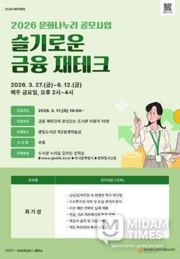 미담타임스 김준완 기자 | 경상북도교육청 영일도서관은 오는 3월 27일부터 6월 12일까지 매주 금요일, 도서관 이용자를 대상으로 ‘2026 문화나누리 공모사업’의 일환인 ‘슬기로운 금융 재테크 ’강좌를 운영한다.