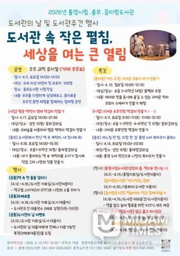 미담타임스 황명수 기자 | 통영시 시립도서관은 도서관의 날(4월 12일)과 도서관주간(4월 12일~18일)을 맞아“도서관 속 작은 펼침, 세상을 여는 큰 열림”을 주제로 4월 한 달 동안 시민들이 책과 문화를 함께 즐길 수 있는 다양한 독서문화 프로그램을 운영한다고 19일 밝혔다.