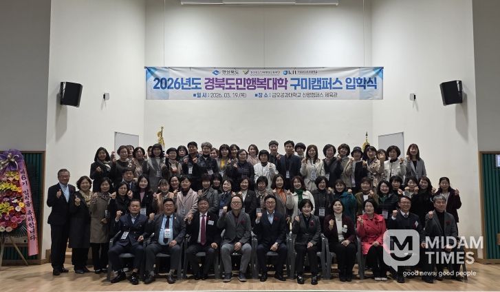미담타임스 김준완 기자 | 구미시는 19일 국립금오공과대학교 평생교육원 실내체육관에서 신입생 55명과 총동창회 회원 등 70여 명이 참석한 가운데 ‘2026년 제6기 도민행복대학 구미캠퍼스 명예학사과정 입학식’을 개최했다.