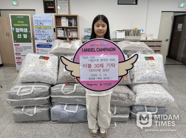화원읍 행정복지센터는 지난 19일 달성중학교 1학년 조아인 양이 관내 저소득 가구를 돕기 위해 이불 30채를 기부했다고 밝혔다. 이번 기부는 조 양이 최근 ‘제51회 금오대상’ 선행청소년 부문 수상으로 받은 장학금에 평소 차곡차곡 모아온 용돈을 보태 마련한 것이라 의미를 더했다.