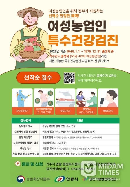 미담타임스 김준완 기자 | 안동시는 여성농업인의 농작업 질환을 예방하고 전문적인 건강관리를 지원하기 위해 ‘2026년 여성농업인 특수건강검진사업’을 본격 추진한다.