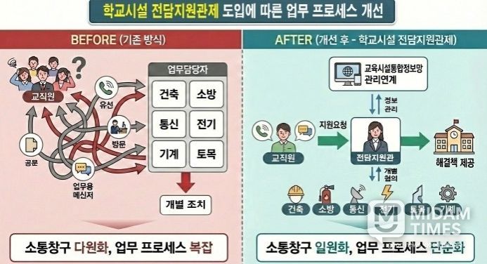 미담타임스 김준완 기자 | 경북교육청은 학교 시설 업무의 전문성과 효율성을 높이고 현장 중심의 신속한 지원 체계를 구축하기 위해 3월부터 학교와 기술직 공무원을 1대 1로 매칭해 전담 지원하는 ‘학교 시설 전담지원관제’를 본격 시행한다고 20일 밝혔다.