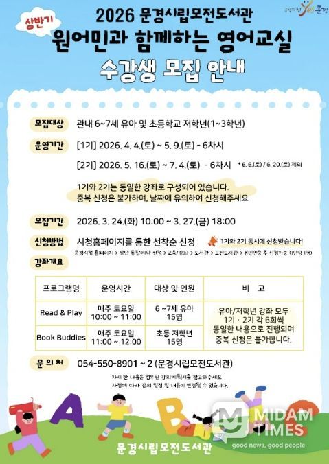 미담타임스 김준완 기자 | 문경시립모전도서관은 오는 4월 4일부터 7월 4일까지 매주 토요일, 상반기 ‘원어민과 함께하는 영어교실’ 프로그램을 운영한다.