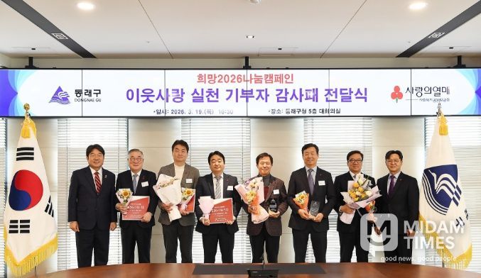 미담타임스 남혜영 기자 | 부산 동래구는 지난 19일 부산사회복지공동모금회(회장 이수태) 주관으로 희망 2026 나눔 캠페인 이웃사랑 실천 기부자 감사패 전달식을 개최하고, 지역사회 나눔 문화 확산에 기여한 기부자들에게 감사의 뜻을 전했다고 밝혔다.