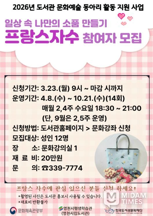 프랑스 자수 동아리는 올해 4월부터 10월까지 운영되며, 이달 23일부터 시립도서관 홈페이지에서 참여 신청을 받는다.