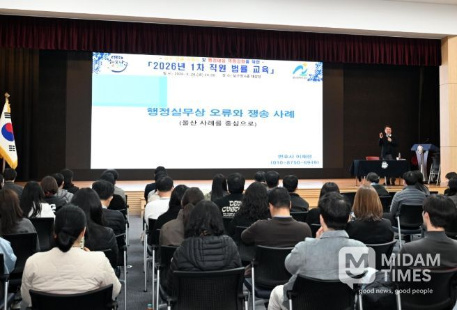 미담타임스 김준완 기자 | 울산 남구는 20일 구청 6층 대강당에서 직원 130여 명을 대상으로 ‘2026년 1차 직원 법률 교육’을 개최했다.
