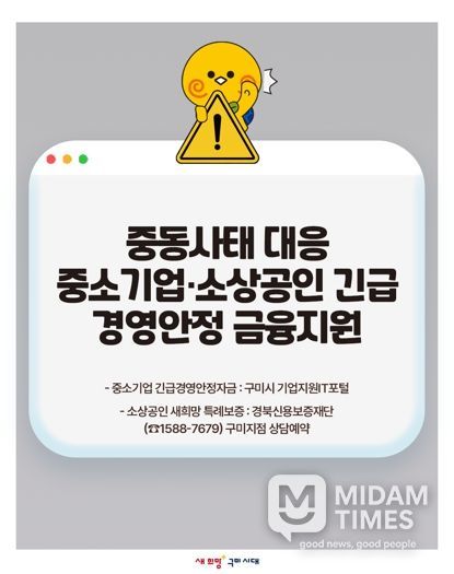 미담타임스 김준완 기자 | 구미시는 중동 지역 정세 불안에 따른 글로벌 공급망 차질과 원자재 가격 상승 등으로 경영 애로가 우려되는 지역 중소기업과 소상공인을 지원하기 위해 긴급 경영안정 금융지원을 추진한다.