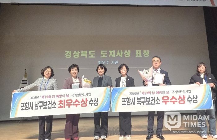 미담타임스 김준완 기자 | 포항시 남북구보건소는 지난 20일 칠곡경북대학교병원에서 열린 제19회 암 예방의 날 기념식에서 2025년 경북 지역 국가암관리사업 평가 우수기관으로 선정돼 남구보건소는 최우수상을, 북구보건소는 우수상을 각각 수상했다.