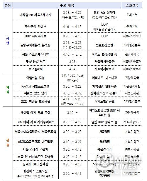 2026 서울스프링페스티벌(4.10.~5.5.), 동대문디자인플라자(DDP) 뮤직라이트쇼(4.6.~4.12.), K-pop 성지 도보관광코스(3.19.~), 서울스테이 라운지(3.20.~4.12.) 등을 3~4월 집중운영한다.