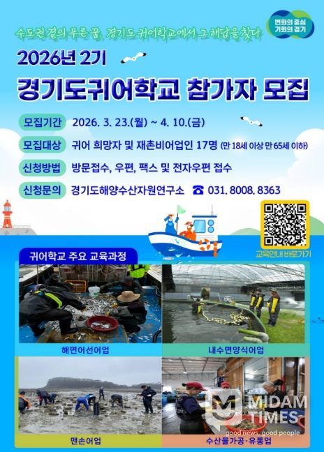 미담타임스 정주환 기자 | 경기도해양수산자원연구소는 귀어 희망자의 어촌 정착을 지원하기 위해 4월 10일까지 ‘2026년 2기 귀어학교’ 교육 프로그램 참가자를 모집한다.