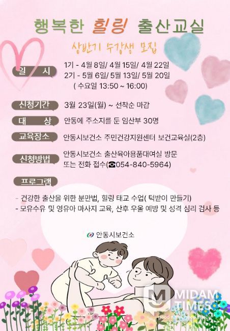 미담타임스 김준완 기자 | 안동시는 임신․출산에 대한 체계적인 정보 제공과 건강한 출산 환경 조성을 위해 예비 엄마를 대상으로 ‘행복한 힐링 출산교실’을 운영한다.