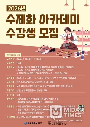 미담타임스 전해찬 기자 | 대구 중구는 오는 4월 15일까지 수제화 산업 전문 인력 양성을 위한 ‘2026년 수제화 아카데미’ 수강생을 모집한다.