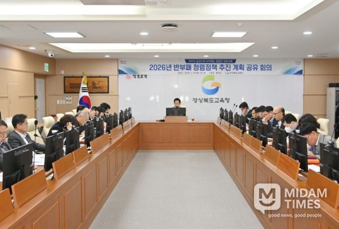 미담타임스 김준완 기자 | 경북교육청은 23일 본청 홍익관에서 교육감 주재로 부교육감을 비롯한 본청 간부 22명이 참석한 가운데 ‘2026년 반부패 청렴정책 추진 계획 공유 회의’를 개최하고, 청렴도 향상을 위한 정책 실행을 본격화했다고 밝혔다.