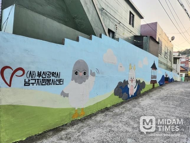 미담타임스 남혜영 기자 | (사)부산남구자원봉사센터와 부경대 벽화봉사단 ‘절영회’는 지난 3월 22일 남구 신선로337번길 17-20 일원 담벼락에서 ‘붓끝으로 그리는 세상’ 사업을 진행하며 지역의 오래된 담벼락 약 30미터 구간에 생동감 있는 벽화를 조성했다고 밝혔다.