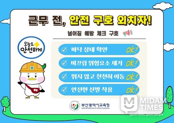 부산광역시교육청은 산업재해 통계자료 분석을 기초로 지난해 2분기 자주 발생했던 ‘넘어짐’ 사고를 예방하기 위한 행동수칙 안내문을 현장에 배포했다고 24일 밝혔다.