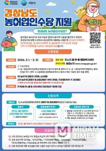 미담타임스 황명수 기자 | 사천시농업기술센터는 경상남도 농어업인수당 지원 사업 신청 접수를 오는 3월 31일까지 받는다고 24일 밝혔다.