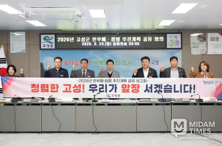 미담타임스 황명수 기자 | 고성군은 3월 23일 군청 중회의실에서 군수 주재로 국장 및 부서장 등 간부공무원들이 참석한 가운데 ‘2026년 반부패·청렴 추진계획 공유 회의’를 개최했다고 밝혔다.