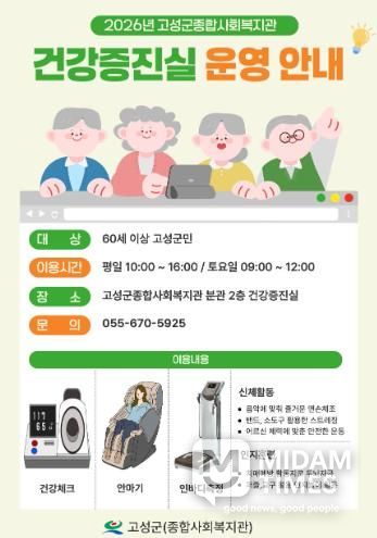 건강증진실은 평일 오전 10시부터 오후 4시까지, 토요일은 오전 9시부터 12시까지 운영되며, 고성군에 거주하는 60세 이상 어르신이라면 누구나 무료로 이용할 수 있다.