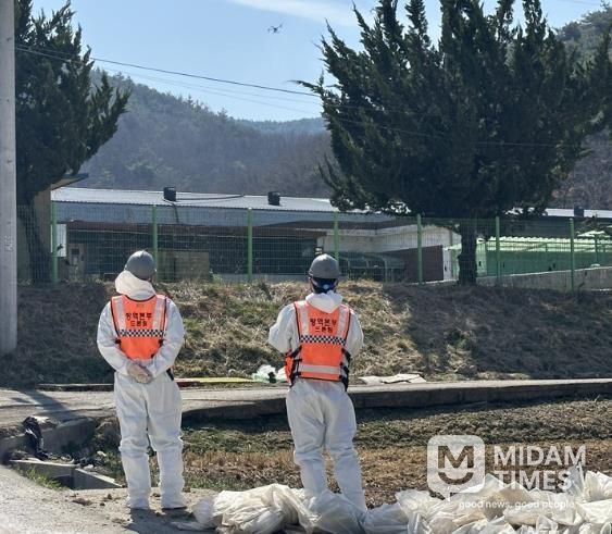 또한 축협공동방제단과 군 방제차량을 투입하고, 가축방역위생지원본부에 드론 방제를 요청해 발생지와 인근 농장에 대한 공동 방제를 실시하며, 멧돼지 기피제 살포와 소독 초소를 2개소 설치하여 사람과 출입 차량의 소독을 강화하고 있다.
