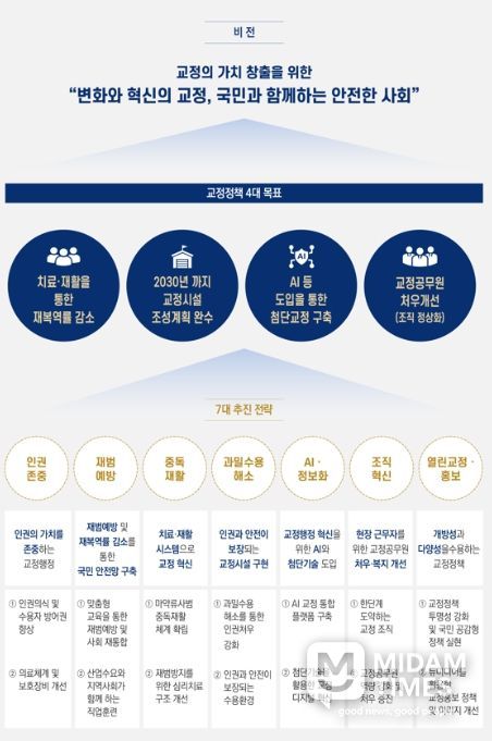 이를 실현하기 위해 인권의 가치를 존중하는 교정행정, 재범예방 및 재복역률 감소를 통한 국민 안전망 구축, 치료·재활 시스템으로 교정 혁신, 인권과 안전이 보장되는 교정시설 구현, 교정행정 혁신을 위한 인공지능(AI)과 첨단기술 도입, 현장 근무자를 위한 교정공무원 처우·복지 개선, 개방성과 다양성을 수용하는 교정정책 등의 7대 전략과 그 세부사항을 담고 있다.