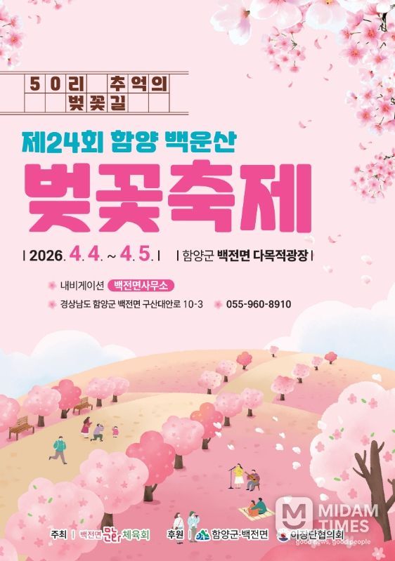 미담타임스 황명수 기자 | 함양군은 ‘제24회 함양 백운산 벚꽃축제’가 오는 4월 4일부터 5일까지 이틀간 백전면 다목적광장 일원에서 개최된다고 밝혔다.