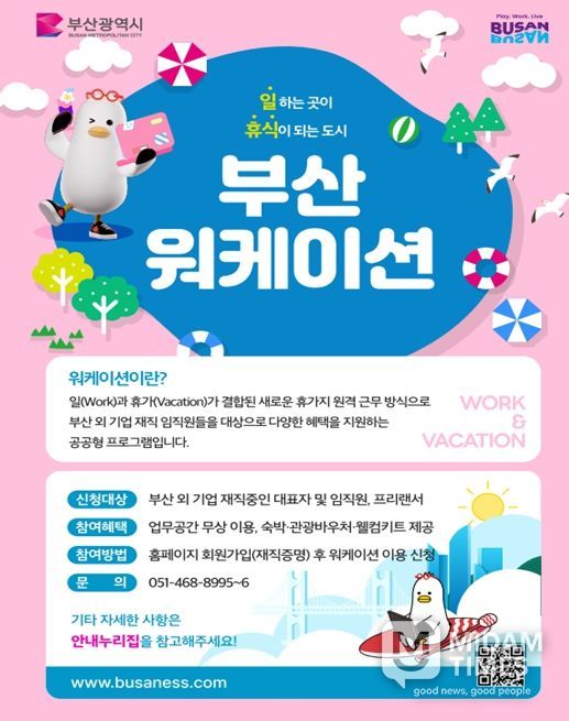 미담타임스 남혜영 기자 | 부산시는 한국관광공사가 주최하는 '2026년 워케이션 우수모델' 공모사업에 '부산형 워케이션(휴가지 원격근무)'이 전국을 대표하는 워케이션 도시로 최종 선정됐다고 오늘(24일) 밝혔다.
