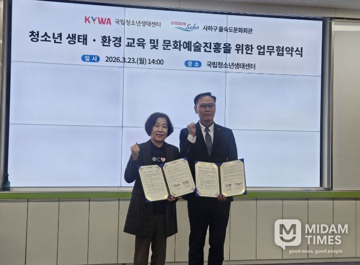 미담타임스 남혜영 기자 | 사하구 을숙도문화회관(관장 박미혜)은 한국청소년활동진흥원이 운영하는 국립청소년생태센터(원장 오재법)와 지난 3월 23일 청소년 문화 예술 활성화를 위한 업무협약(MOU)을 체결했다고 밝혔다.