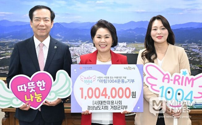미담타임스 황명수 기자 | 거창군은 지난 24일 (사)대한미용사회 경상남도지회 거창군지부(지부장 구희자)가 지역내어려운 이웃을 돕기 위한 성금 100만 4천 원을 아림1004운동에 기부했다고 밝혔다.