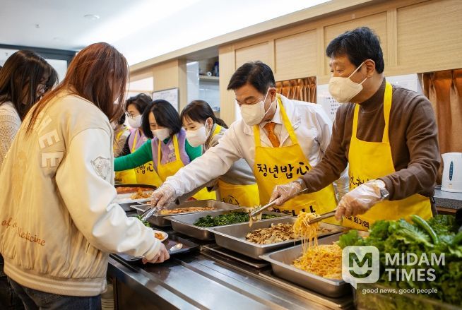 미담타임스 정주환 기자 | 서울 동대문구 경희대 정문 옆 연화사 공양간에 점심시간을 앞두고 대학생들이 하나둘 모여들었다. 수업을 마친 학생들이 줄을 서자 사찰 안은 금세 북적였다. 스님들과 자원봉사자들이 분주히 음식을 나르고, 공양간 앞에서는 학생들끼리 “오늘 메뉴가 뭐냐”며 웃음 섞인 대화를 주고받았다. 그 줄 앞에 이필형 동대문구청장도 섰다. 학생들에게 직접 음식을 건네며 “밥 잘 챙겨 먹고, 학업과 미래 준비도 힘내라”고 말을 건넸다. 이 구청장은 연화사 ‘청년밥心’ 현장에서 배식자로 참여해 대학생들을 격려했다.