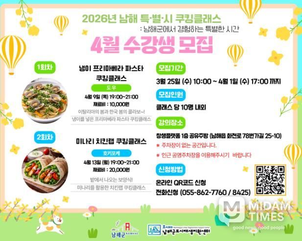 미담타임스 황명수 기자 | 남해군이 봄 제철 식재료를 활용해 군민들에게 특별한 미식 경험을 선사하는 쿠킹클래스를 마련하고 수강생 모집에 나선다.