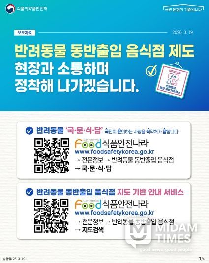 한편, 반려동물 동반 출입 음식점 현황(지도 기반 안내 서비스), 반려동물 국·문·식·답(국민이 문의하는 사항을 식약처가 답한다), 운영 매뉴얼 및 홍보자료, 질의응답 등 관련 자료는 식품안전나라 누리집에서 확인할 수 있다.