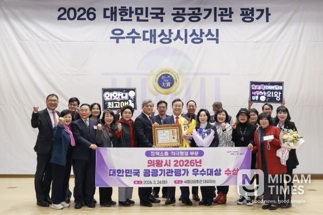 미담타임스 정주환 기자 | 의왕시가 3월 24일 국회의원회관 대회의실에서 열린 ‘2026 대한민국 공공기관평가 우수대상’시상식에서‘정책소통·적극행정 부문’에 선정되는 영예를 안았다.