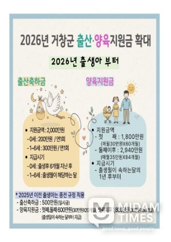주요 개정내용으로는 출산축하금 지원금액을 출생아 1명당 500만원에서 2,000만원으로 확대하고, 기존 일시금 지급방식에서 7년 분할(연 1회) 지급으로 변경해 거창군 내 장기 정착을 유도할 계획이다.