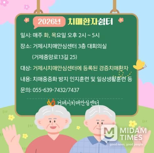 한편 거제시치매안심센터 쉼터 프로그램은 경증치매환자를 대상으로 연중 운영되고 있으며, 이용 관련 문의는 유선으로 전화하면 된다.