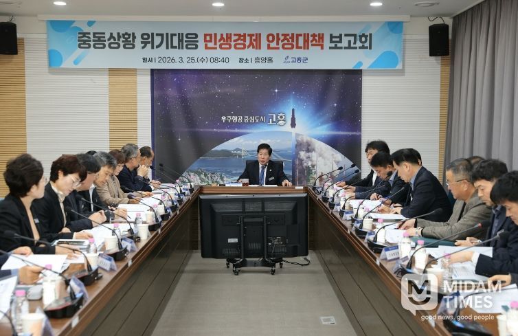 미담타임스 정인화 기자 | 고흥군은 25일 군청 흥양홀에서 군수 주재로 각 부서장이 참석한 가운데 ‘중동 상황 위기대응 민생경제 안정대책 보고회’를 개최하고, 최근 중동 상황으로 인한 경제위기 극복을 위한 분야별 대응 방안을 집중적으로 점검했다.