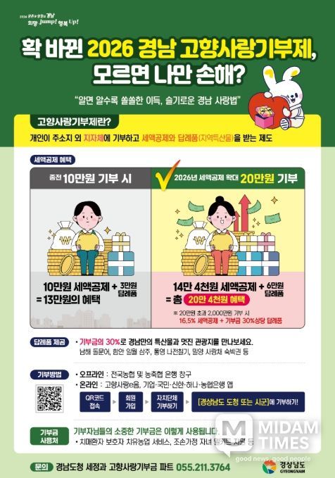 미담타임스 황명수 기자 | 경상남도는 2026년부터 고향사랑기부제 세액공제 혜택이 확대된다고 밝혔다.