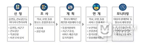 통합돌봄 서비스 신청․접수는 관할 지자체 읍면동 또는 건강보험공단 지사를 방문하거나 우편․팩스를 통해 할 수 있으며, 신청자의 돌봄 필요도 조사와 개인별 지원계획 수립 절차를 거쳐 시군 전담부서에 설치된 통합지원회의를 통해 제공서비스가 최종 확정된다.