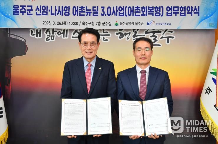 울주군과 한국농어촌공사 울산지사는 이날 군청 소회의실에서 이순걸 군수와 김상훈 지사장 등이 참석한 가운데 ‘어촌뉴딜 3.0 사업’ 위수탁 업무협약을 체결했다.