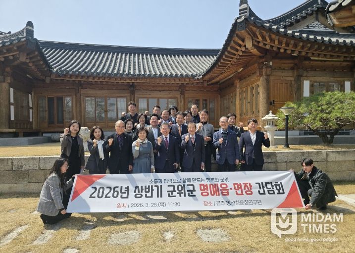 미담타임스 김준완 기자 | 군위군은 지난 3월 26일 경주시 소재 명선차문화연구원에서 김진열 군수를 비롯한 명예읍·면장 및 읍·면장이 참석한 가운데 ‘2026년 상반기 명예읍면장 정책간담회’를 개최했다.