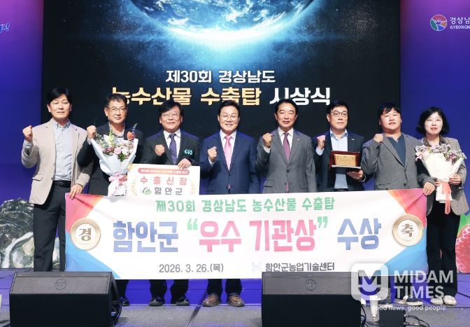 미담타임스 황명수 기자 | 함안군은 지난 26일 창원컨벤션센터에서 열린 ‘제30회 경남도 농수산물 수출탑 시상식’에서 우수 기관으로 선정돼 수출 신장상을 수상했다고 밝혔다.