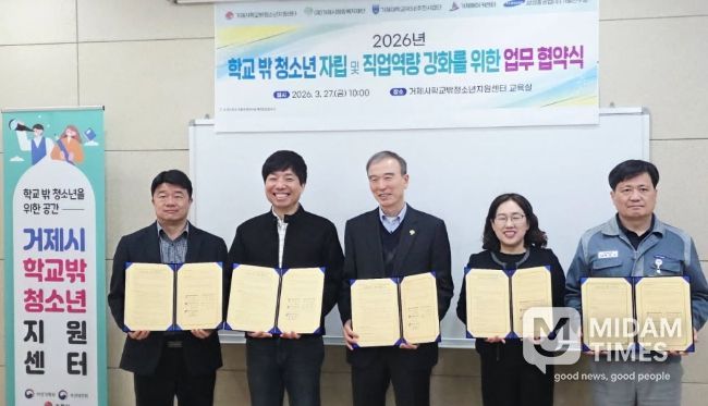미담타임스 황명수 기자 | 거제시학교밖청소년지원센터는 지난 27일 센터 교육실에서‘2026년 학교 밖 청소년 자립 및 직업역량 강화를 위한 업무협약(MOU)’를 체결했다.