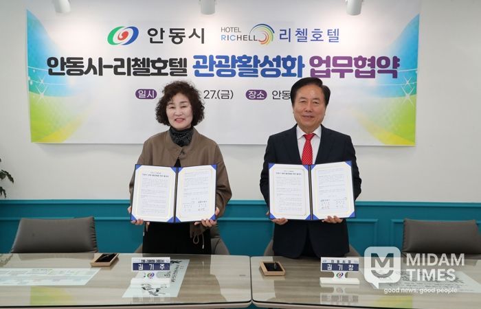 미담타임스 김준완 기자 | 안동시는 안동리첼호텔과 3월 27일 시청 청사에서 안동을 찾는 관광객들에게 실질적인 숙박 혜택을 제공하고 지역관광을 활성화하기 위한 업무협약을 체결했다.